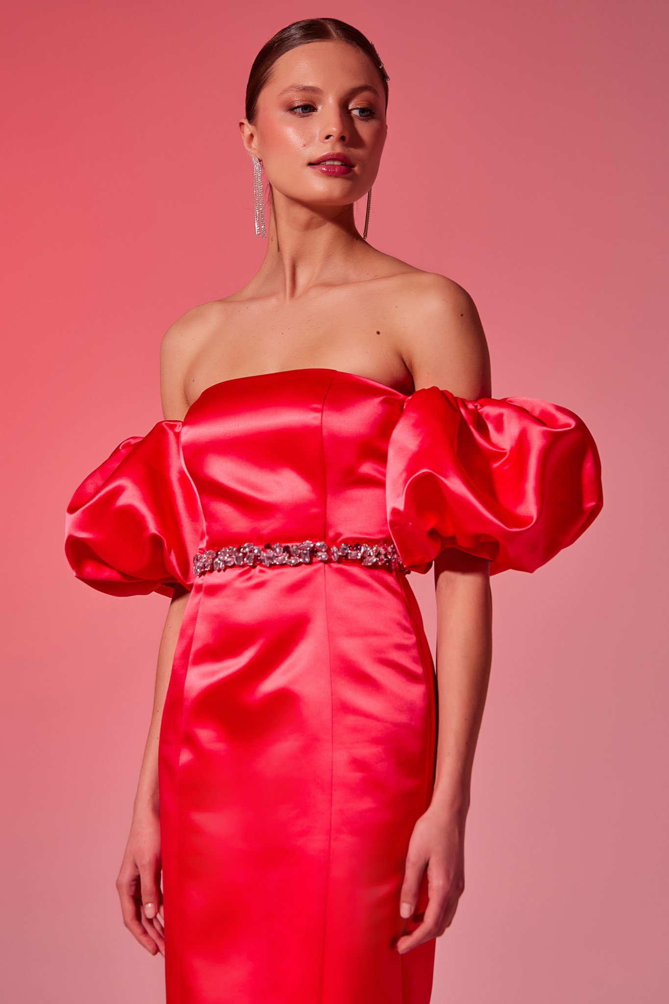 Jenny Dress; El işlemeli, kemerli, kabarık kollu straplez elbise.