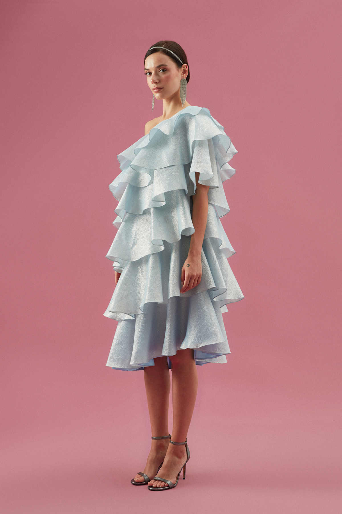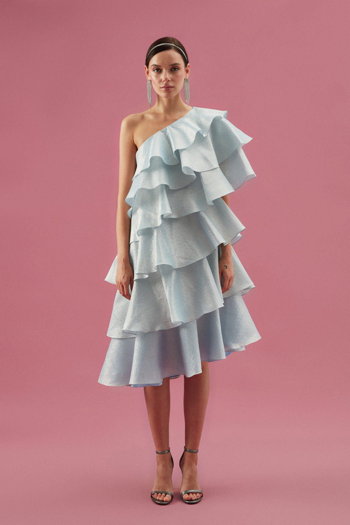 Gisele Dress; Tek omuzlu, katlı elbise.