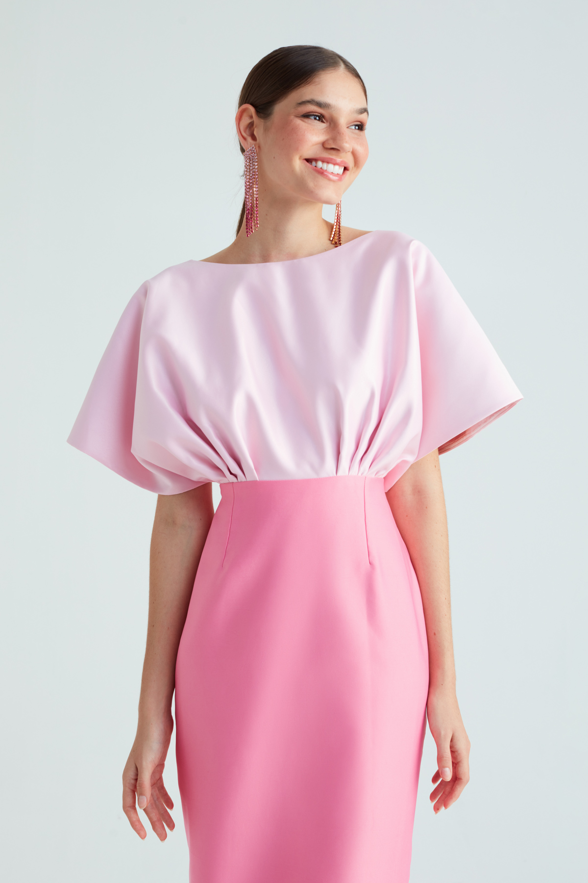 Sirius Dress; İki renkli, sırtında dekoltesi bulunan maxi boy gece elbisesi.