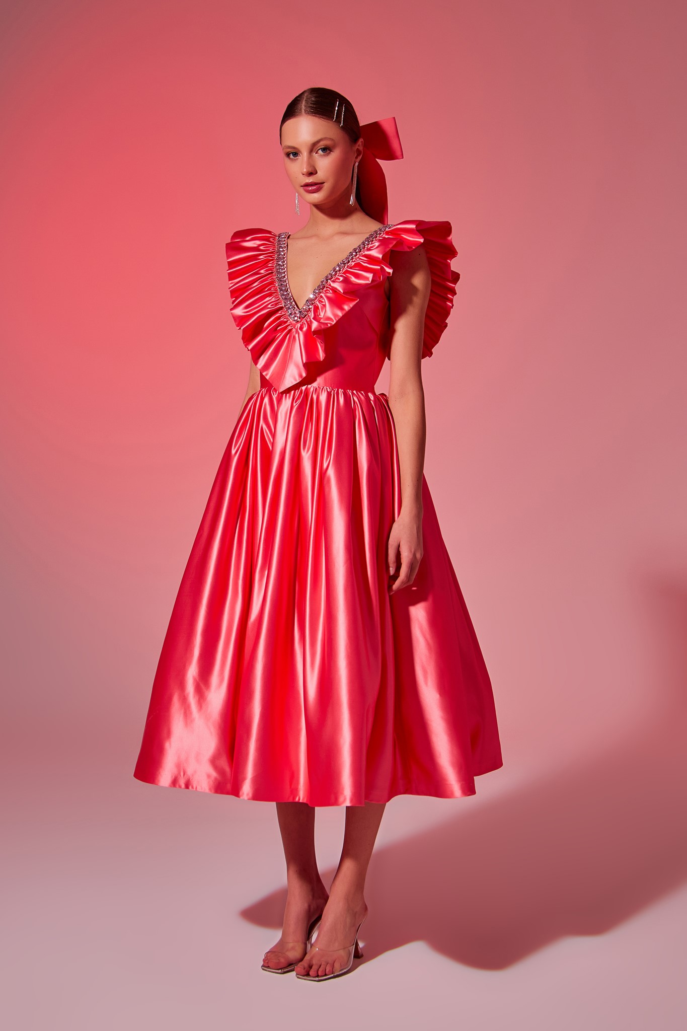 Valencia Dress; Fırfır detaylı, işlemeli V yakalı midi elbise