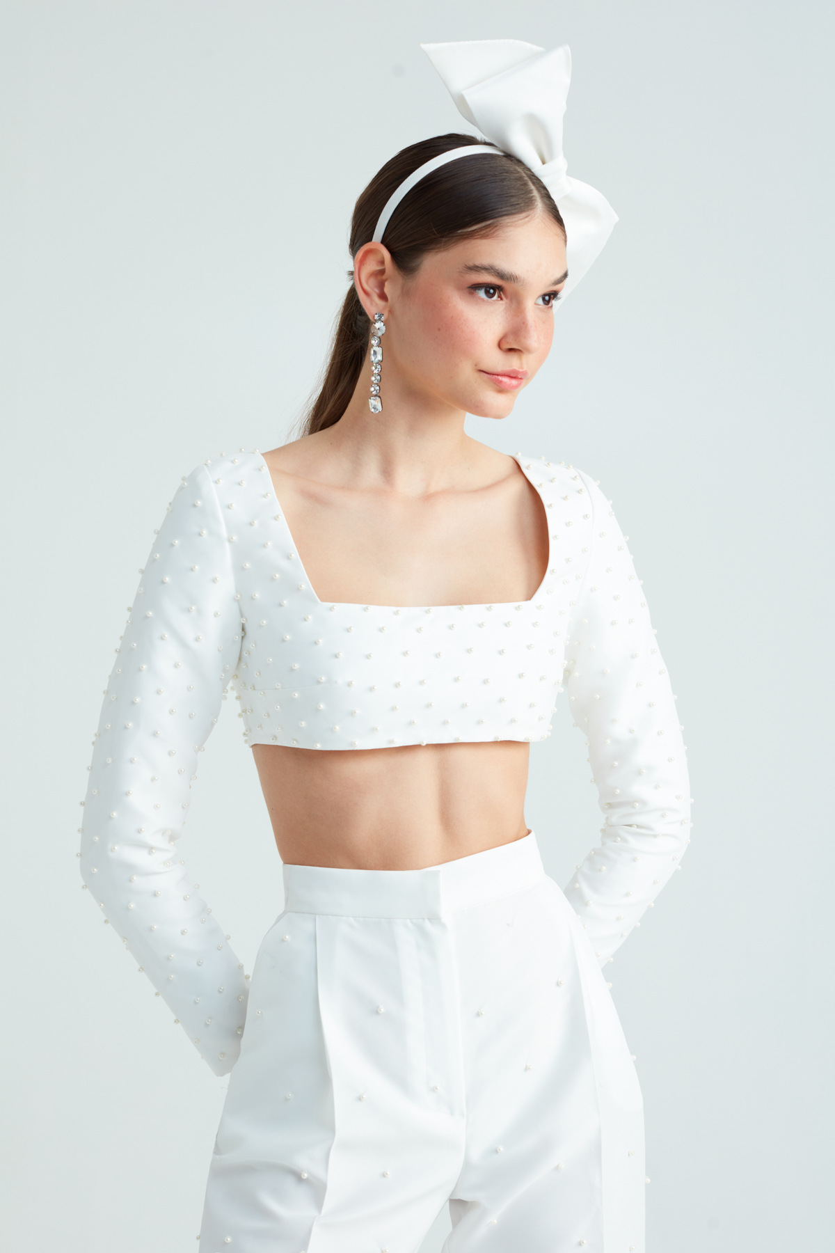 Viola Top; El işçiliği ile kristal taşlarla süslenmiş kısa bluz.